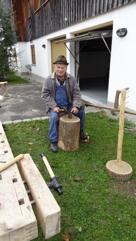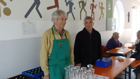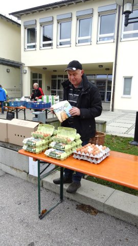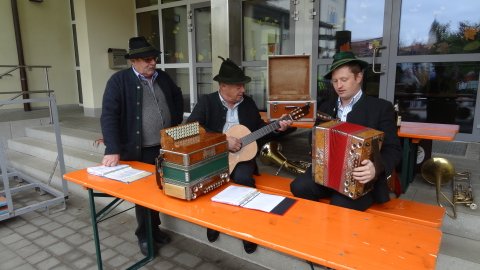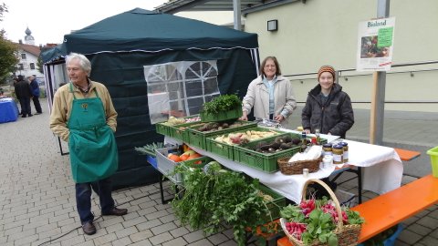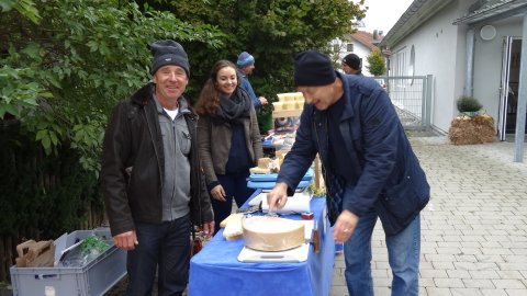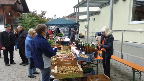 Eine lange sowohl von den beteiligten Anbietern wie auch den Besuchern liebgewonnene Tradition ist der Markt am 2. Samstag im Oktober vor der Schule in Edling. Aus dem reinen Pflanzentausch der Anfangsjahre hat sich ein heimischer Markt entwickelt, bei dem Gemüse, Äpfel, Eier, Käse, Wurst, Brot und weiteren Produkte, die in der Region wachsen oder hergestellt werden zum Verkauf kommen. Wer neue Pflanzen für seinen Garten brauchte, wurde bestimmt am Pflanzentauschwagen fündig, den Edlinger Gartenbesitzer mit ihren inzwischen zu groß und deshalb geteilten Stauden ausgestattet hatten. Natürlich war auch wieder Konrad dabei, der den Sensen einen neuen Schliff verpasste, bei dem die Kinder Zähne für Holzrechen herstellten durften und ein Messerschleifer. Besonders die wunderschönen Türkränze waren gefragt und fanden reißend Absatz. Eine neue Attraktion waren dieses Jahr die vor Ort gebackenen „Auszogne“. Dazu kam dann noch das vielfältige Kuchenangebot, die frisch gebackenen Apfelkücherl und natürlich das Rehragout und die Würstl. So war der Vorraum der Schule immer gut besucht und es herrschte eine fröhliche Stimmung. Dazu trugen auch die drei Musiker bei, die die Marktbesucher unterhielten.