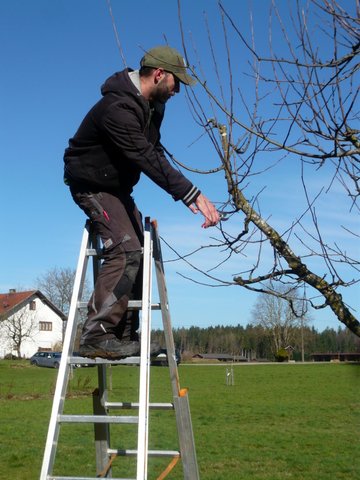Am Samstag, 09. März 2024 trafen sich etwa 15 interessierte Gartenbesitzer bereits um 9.00 Uhr auf der Streuobstwiese, um die Kunst des Baumschneidens zu erlenen. Wie wichtig richtiges Werkzeug ist, erklärte Herr Josef Langgassner zu Beginn der Veranstaltung. Dann zeigte und erläuterte er, wie ein Erziehungsschnitt bei jungen Bäumen durchzuführen ist, um sich dann etwas älteren Obstbäumen zu zuwenden.