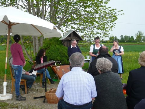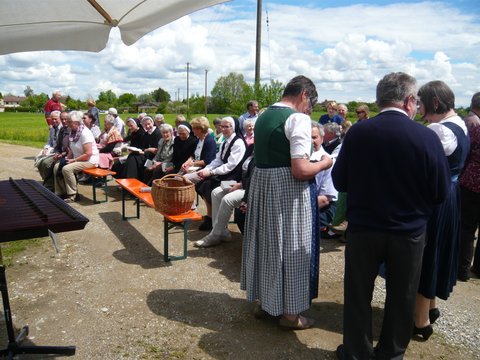 Am Sonntag, 14. Mai fand mit großer Beteiligung die Maiandacht beim Feldkreuz statt. Elisabeth Schex und Roman Müller hatten sie vorbereitet und gestaltet. Dazu spielte die Musikgruppe „Immer gut aufgelegt“. Herr Pfarrer Finkenzeller gab im Anschluss den Segen. Dass es dann zu regnen begann, tat der guten Stimmung keinen Abbruch und so rückte man in der Hütte und unter dem Vordach enger zusammen um Kaffee und Kuchen zu genießen und sich gemütlich zu unterhalten.